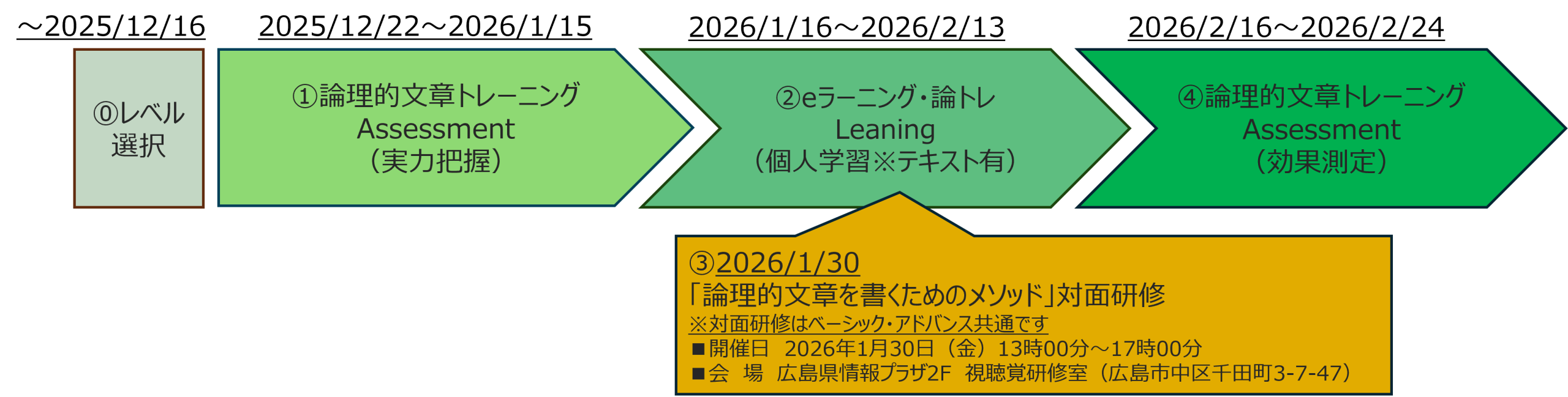 受講期間は2025/12/16~2026/2/24で、この期間中に、オンデマンドによるアセスメントとeラーニング受講、また、1/30に対面研修を実施いたします。