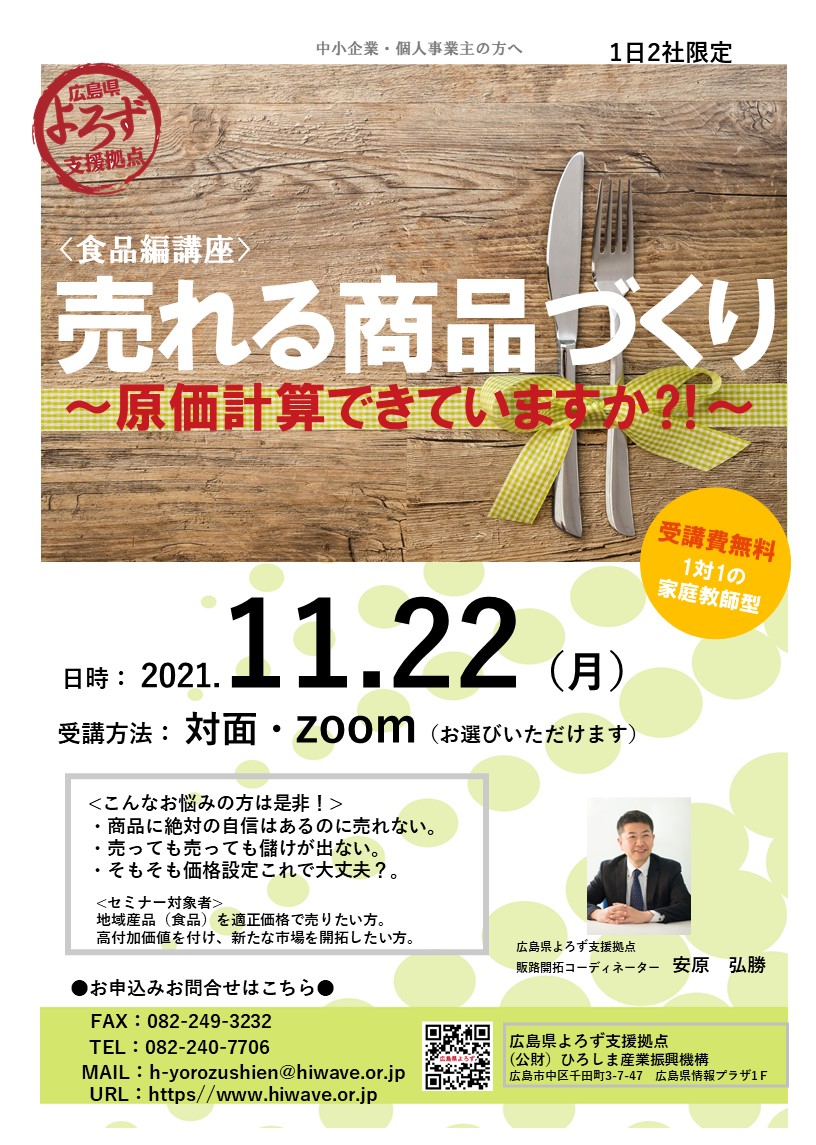(満席となりました)広島県よろず支援拠点 原価計算できていますか⁈【売れる商品づくり講座】・食品編 11/22(月)