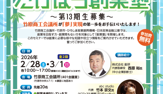 竹原商工会議所、竹原市、日本政策金融公庫との共催により「たけはら創業塾」を開催します。
