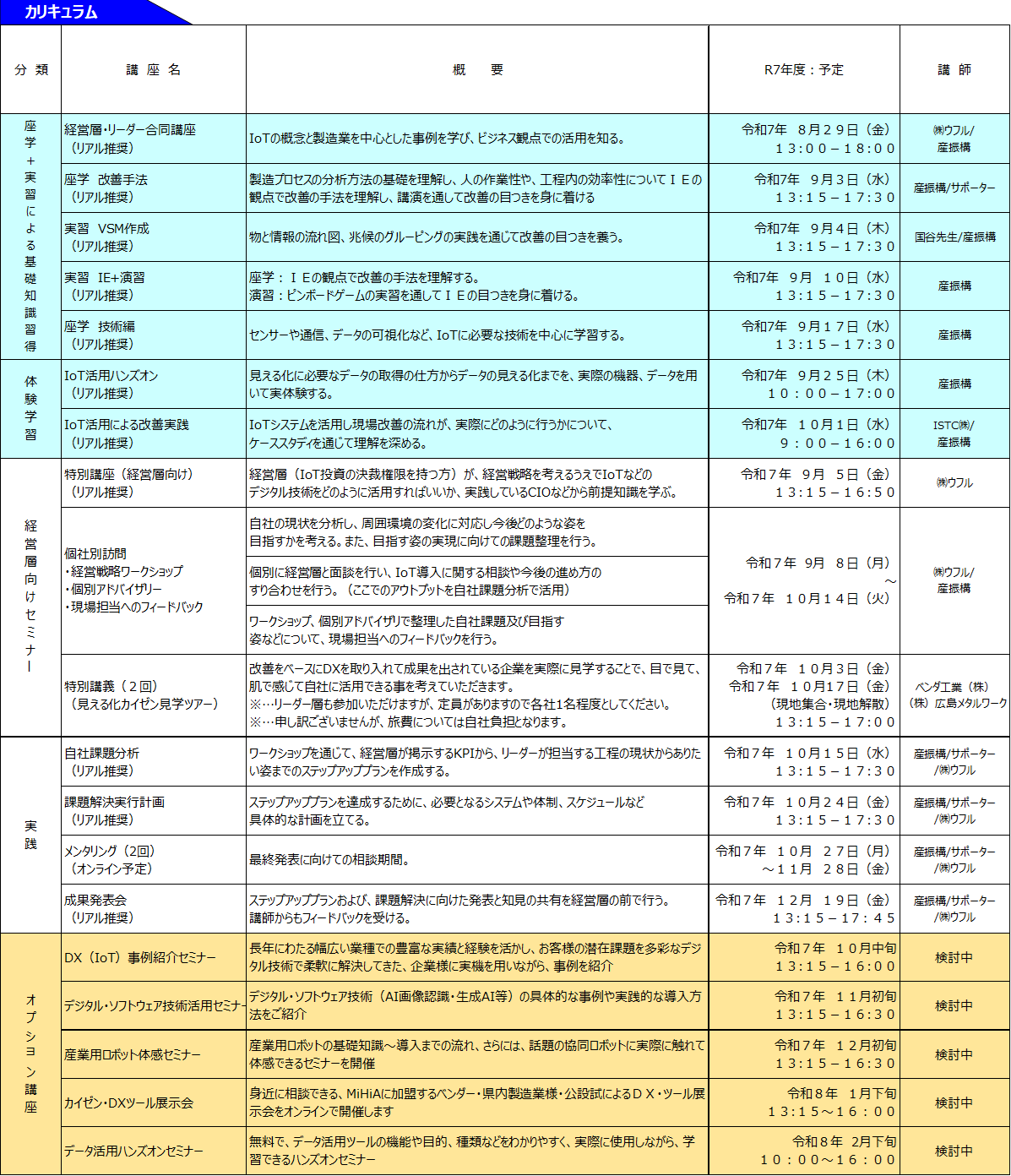 リアル会場:広島県情報プラザ オンライン:Web会議ツールZoomを利用 (※…8月29日と12月19日のみ開催場所が外部会場になります。 会場名:サテライトキャンパスひろしま 住所:広島県広島市中区大手町1丁目5−3) - 対象者 … 広島県内に事務所又は事業所を有するものづくり中小企業にお勤めで、現場リーダー